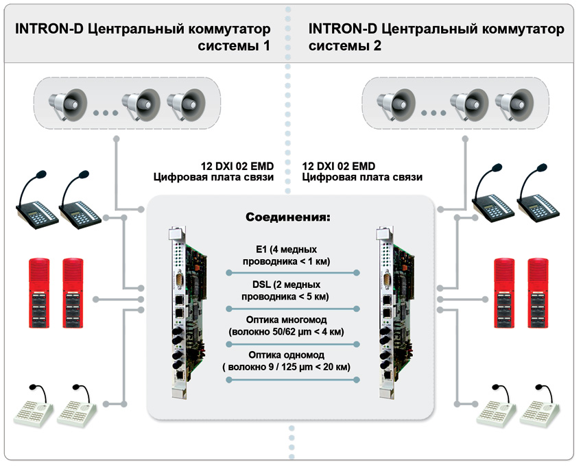 Объединение централей осуществляется при помощи интерфейсных плат серии 12DXI, которые используются для стыковки 2х и более централей. Соединение центральных станций возможно по проводным (по Е1 или DSL) или оптическим (одномодовое или многомодовое волокно) линиям связи. Поддерживается схема объединения типа «звезда» или «кольцо». Система централей представляет собой единую сеть и может управляться и обслуживаться одним оперативным дежурным центра связи.