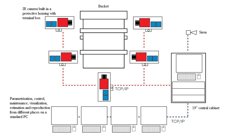 Bucket Thermographic Control System (BTCS) make use of advanced infrared technology for non-destructive and non-contact control of temperature on buckets surface. Up to five infrared cameras are watching the bucket as it moves. The temperature is measured automatically on the basis of information received from cameras.