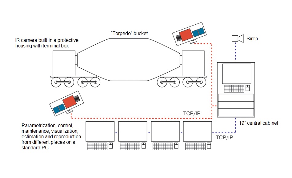 “Torpedo” Bucket Thermographic Control System (TBTCS) make use of advanced infrared technology for non-destructive and non-contact temperature control on the surface of “torpedo” type buckets. Two infrared cameras are watching the surface of “torpedo” bucket as it moves. The temperature is measured automatically on the basis of information received from video-cameras.