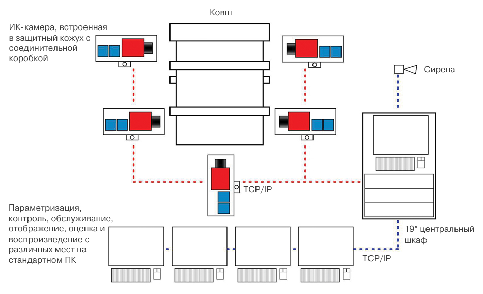 Система Термографического Контроля за Ковшами (СТКК) использует современные инфракрасные технологии для неразрушающего и бесконтактного контроля температуры поверхности ковшей. До пяти инфракрасных камер наблюдают за поверхностью ковша в процессе его перемещения. Определение температуры производится полностью автоматически на основании информации от видеокамер.