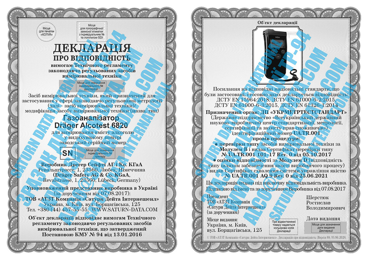 Виробник Dräger Safety AG & Co. KGaA (Німеччина) визначив ТОВ «АТЗТ Компанія «Сатурн Дейта Інтернешенл» уповноваженим представником щодо Impairment Checks Products в Україні та надав письмове доручення, зокрема: складати та підписувати від імені та за дорученням виробника Декларації про відповідність Технічному регламенту законодавчо регульованих засобів вимірювальної техніки, що затверджений Постановою КМУ №94 від 13.01.2016.