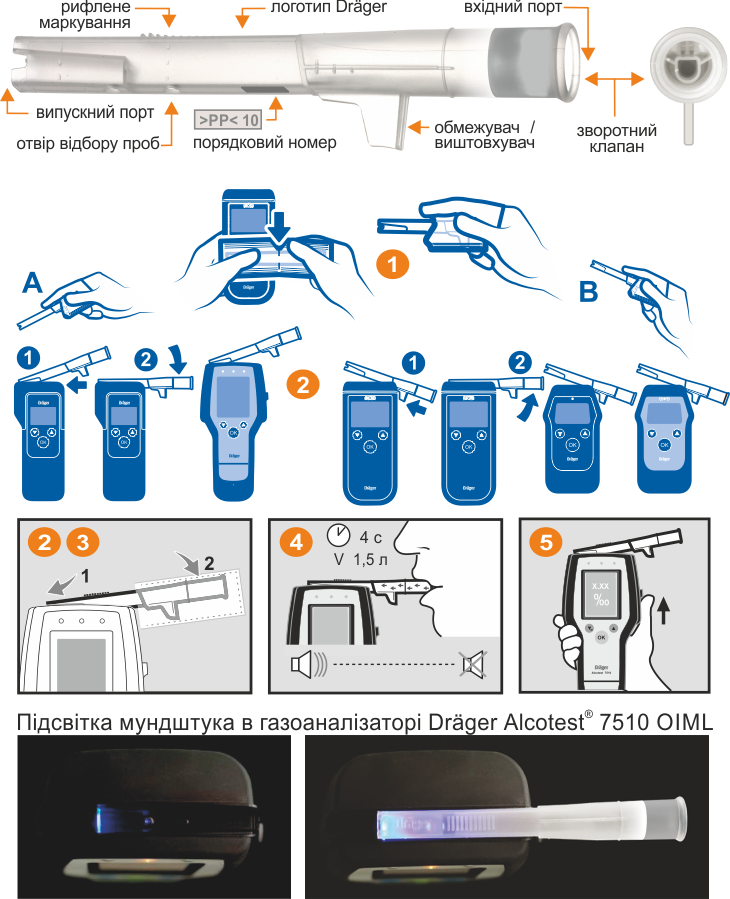 Звертаємо Вашу увагу, що у Керівництві з експлуатації Dräger Alcotest® 3000 / 5510 / 5820 / 6510 / 6810 / 6820 / 7510 OIML заборонено використання мундштуків інших неузгоджених виробників, інакше прилади Dräger Alcotest® можуть вийти з ладу, не будуть відповідати заводським (найкращим у світі) метрологічним характеристикам, втратять гарантійний термін.
