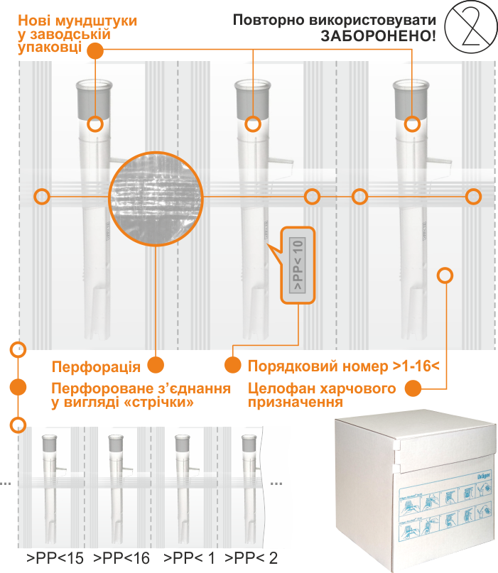 Мундштуки Dräger Alcotest Mouthpieces Standard зі зворотним клапаном призначені для використання у комплекті з алкотестерами для вимірювання вмісту алкоголю у видихуваному повітрі Dräger Аlcotest® 7510 OIML, конструктивно сумісні з моделями Dräger Аlcotest® 3000 / 5510 / 5820 / 6510 / 6810 / 6820 . Кожний мундштук запечатаний в індивідуальну заводську упаковку. Для зручності розпаковки мундштука кожна індивідуальна упаковка має перфорацію. Упаковки мундштуків поєднані послідовно у вигляді «стрічки» та з`єднані між собою за допомогою перфорації. Матеріал упаковок - харчовий целофан. Порядковий номер мундштука індивідуально вказаний на кожному мундштуку і повторюється послідовно від >РР< 1 до >РР< 16, після чого нумерація повторюється знову. Мундштуки Dräger Alcotest Mouthpieces Standard зі зворотним клапаном призначені для одноразового використання згідно гігієнічним вимогам